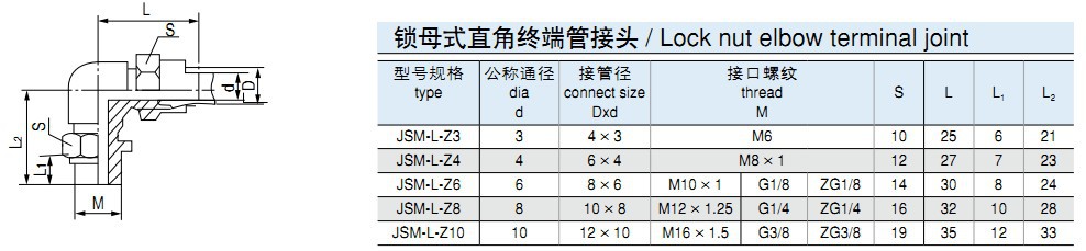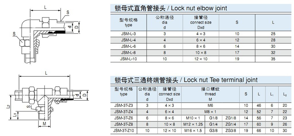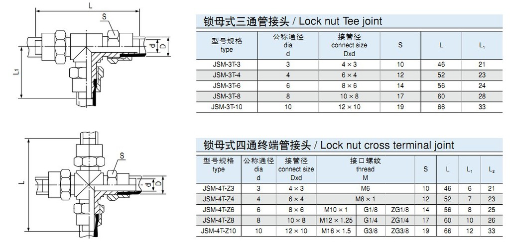 • 标记示例: ①:锁母式三通终端管接头 公称通径 Ø6MM JSM-3T-Z6 M10×1