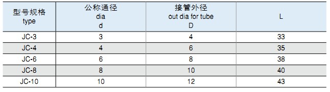安装及应用 一、JC系列插入式管接头,适用于连接硬质、半硬质尼龙管、塑料管,*大工作压力为1.0MPa。该系列管接头安装方便,密封可 外形尺寸