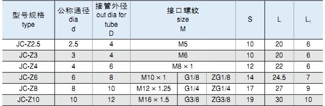 安装及应用 一、JC系列插入式管接头,适用于连接硬质、半硬质尼龙管、塑料管,*大工作压力为1.0MPa。该系列管接头安装方便,密封可 外形尺寸