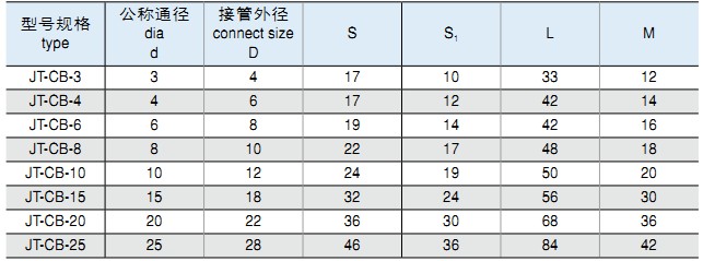 一、JT系列卡套式管接头适用于有色金属管,编织尼龙管的连接。*大工作压力为1.0MPa