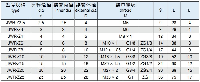 安装及应用 一、JWR系列外插式管接头,适用于连接软质尼龙管,塑料管及胶管。*大工作压力为1.0MPa。该系列接头具有结构简单,使用方便,安装牢固等优点。 外形尺寸