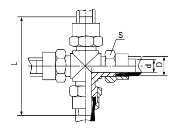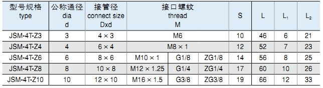 • 标记示例: ①:锁母式三通终端管接头 公称通径 Ø6MM JSM-3T-Z6 M10×1