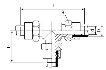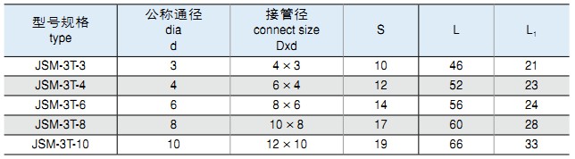 • 标记示例: ①:锁母式三通终端管接头 公称通径 Ø6MM JSM-3T-Z6 M10×1