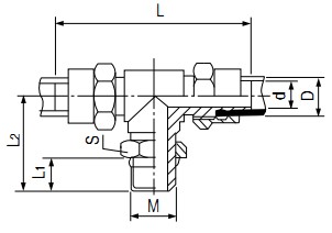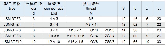 • 标记示例: ①:锁母式三通终端管接头 公称通径 Ø6MM JSM-3T-Z6 M10×1