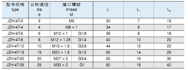 • 标记示例: ①:组合式三通终端管接头 公称通径 Ø6MM JZH-3T-Z6 M10×1