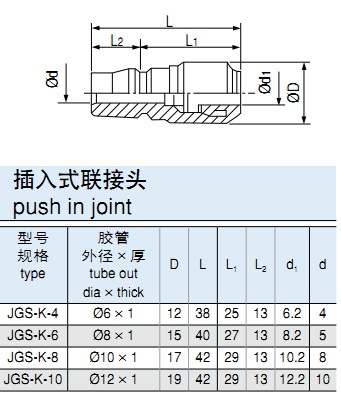 型号规格说明,下图例JGS-W-6A(JGS-K-6B)插入式外螺纹接口。高性能快速接头,外插式内螺纹接口。
