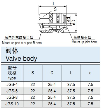 Maximum working pressure for installation and application: 3.5MPa. Working temperature: -10℃~+100℃ Model specification, the following figure shows JGS-W-6A (JGS-K-6B) plug-in external thread interface. High-performance quick connector, external plug-in female thread interface. Dimensions