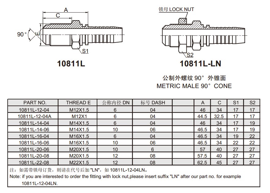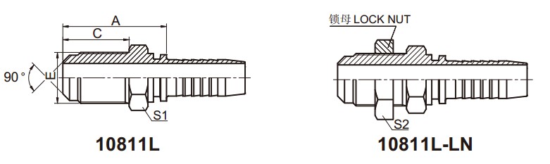 10811L 公制外螺纹90°外锥面 扣压式软管接头