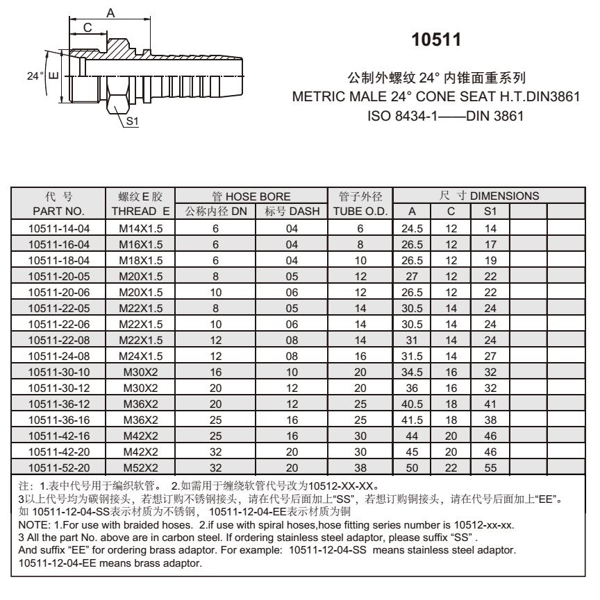 10511 公制外螺纹24°内锥面重系列 扣压式软管接头