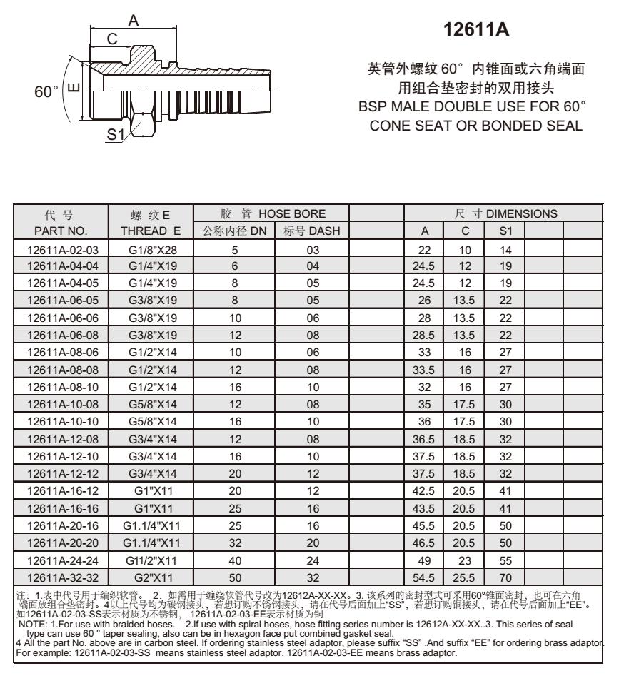 12611A 英管外螺纹60°内锥面或六角端面用组合垫密封的双用接头