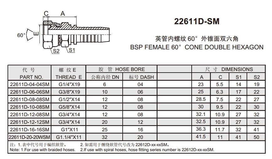 22611D-SM British pipe female thread 60°external cone double hexagon
