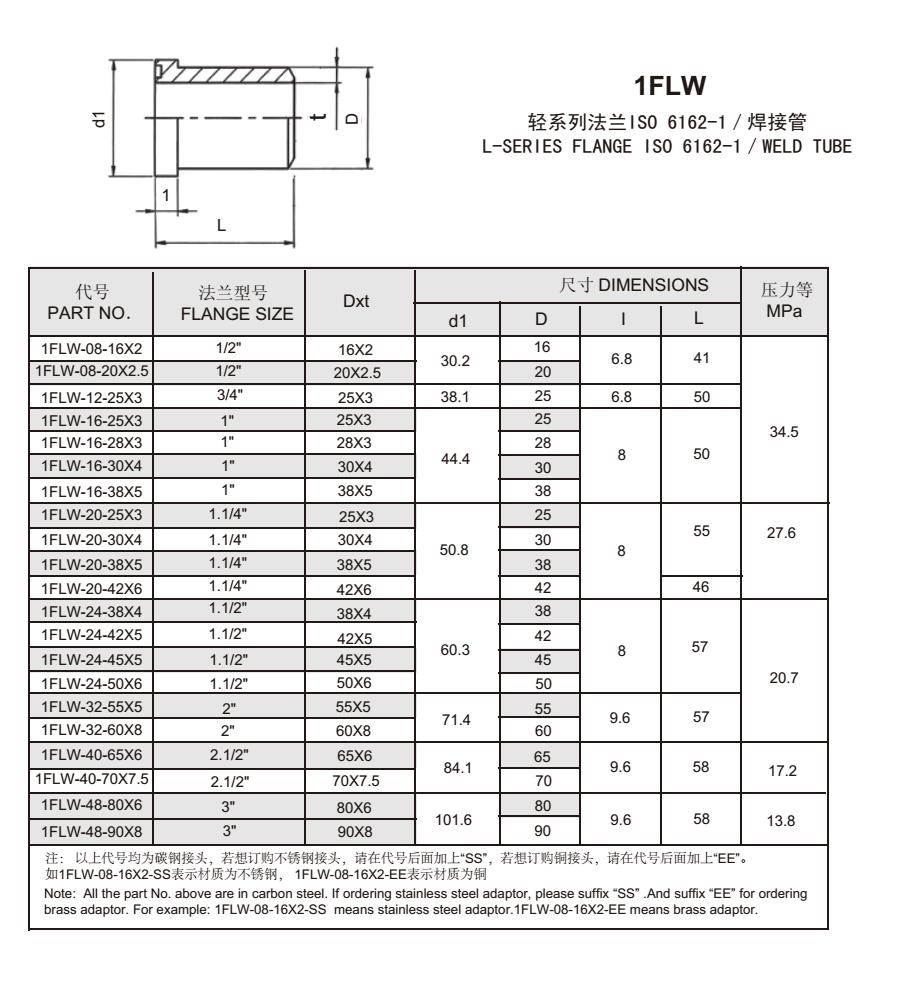 1FLW 轻系列法兰IS0 6162-1/焊接管