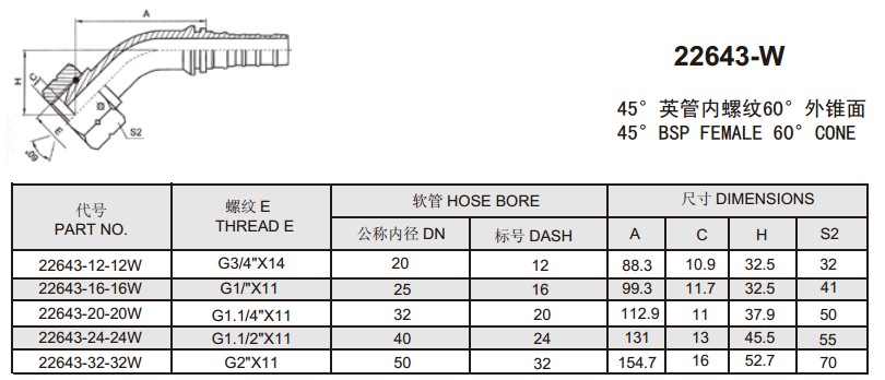 22643-W 45°英管内螺纹60°外锥面