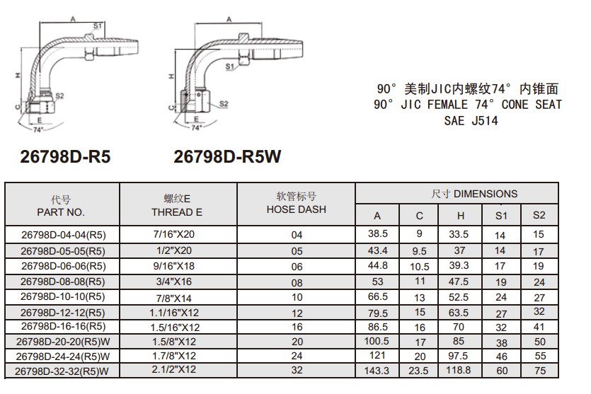 26798D-R5 26798D-R5W 90°美制JIC内螺纹74°内锥面