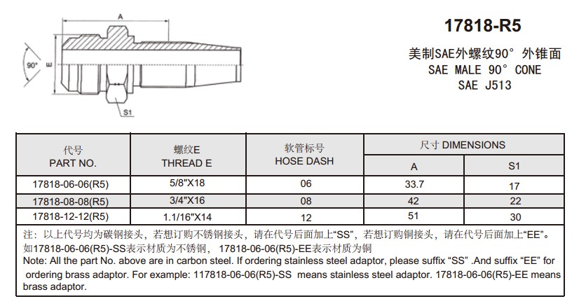 17818-R5 美制SAE外螺纹90°外锥面