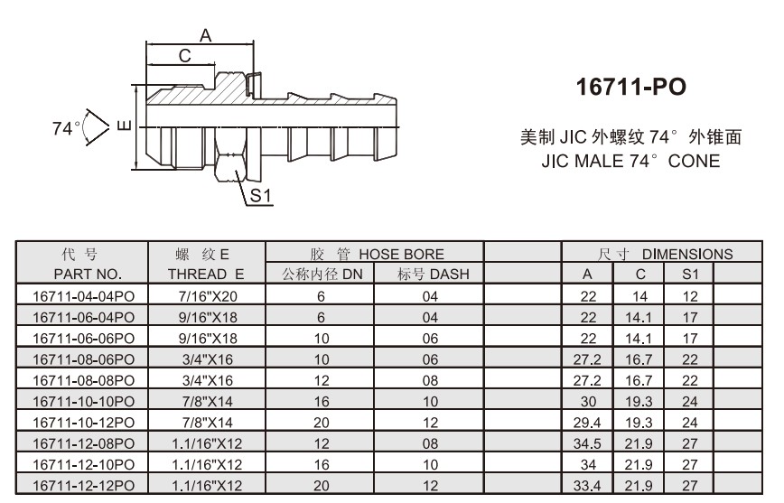 16711-PO 美制JIC外螺纹74°外锥面