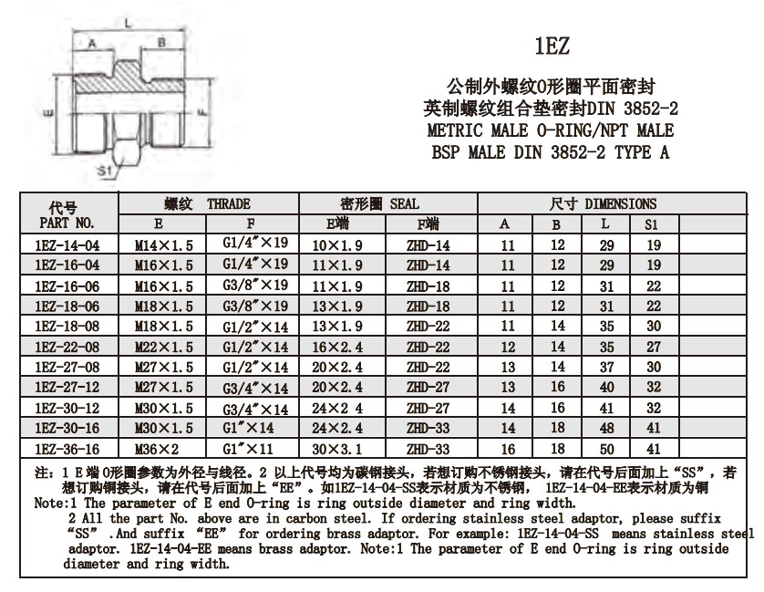 1EZ 公制外螺纹O形圈平面密封英制螺纹组合垫密封DIN 3852-2