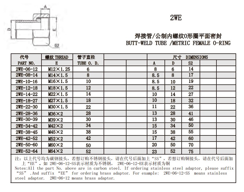 2WE 焊接管/公制内螺纹O形圈平面密封