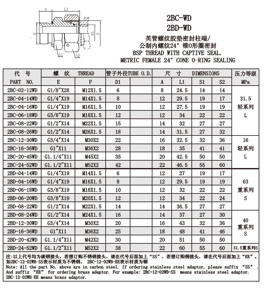 2BC-WD 2BD-WD 英管螺纹胶垫密封柱端/公制内螺纹24°锥O形圈密封