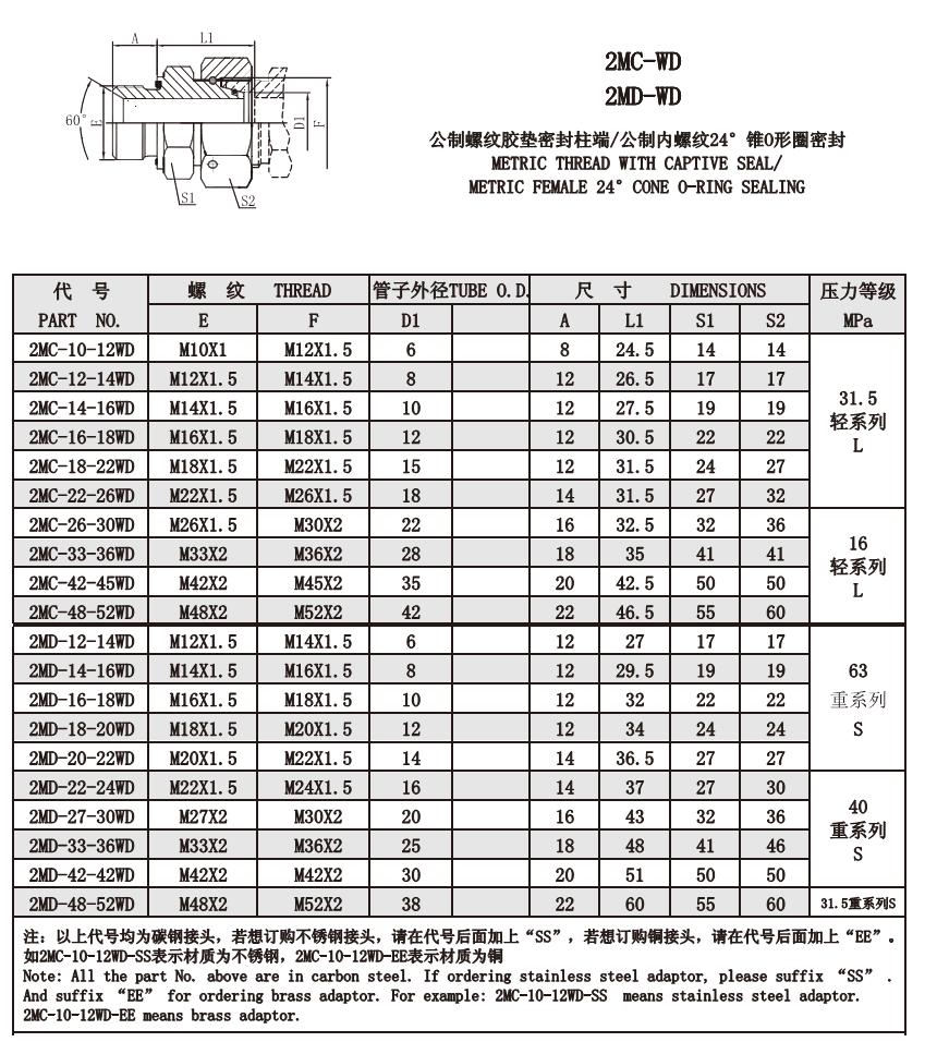2MC-WD 2MD-WD 公制螺纹胶垫密封柱端/公制内螺纹24°锥O形圈密封
