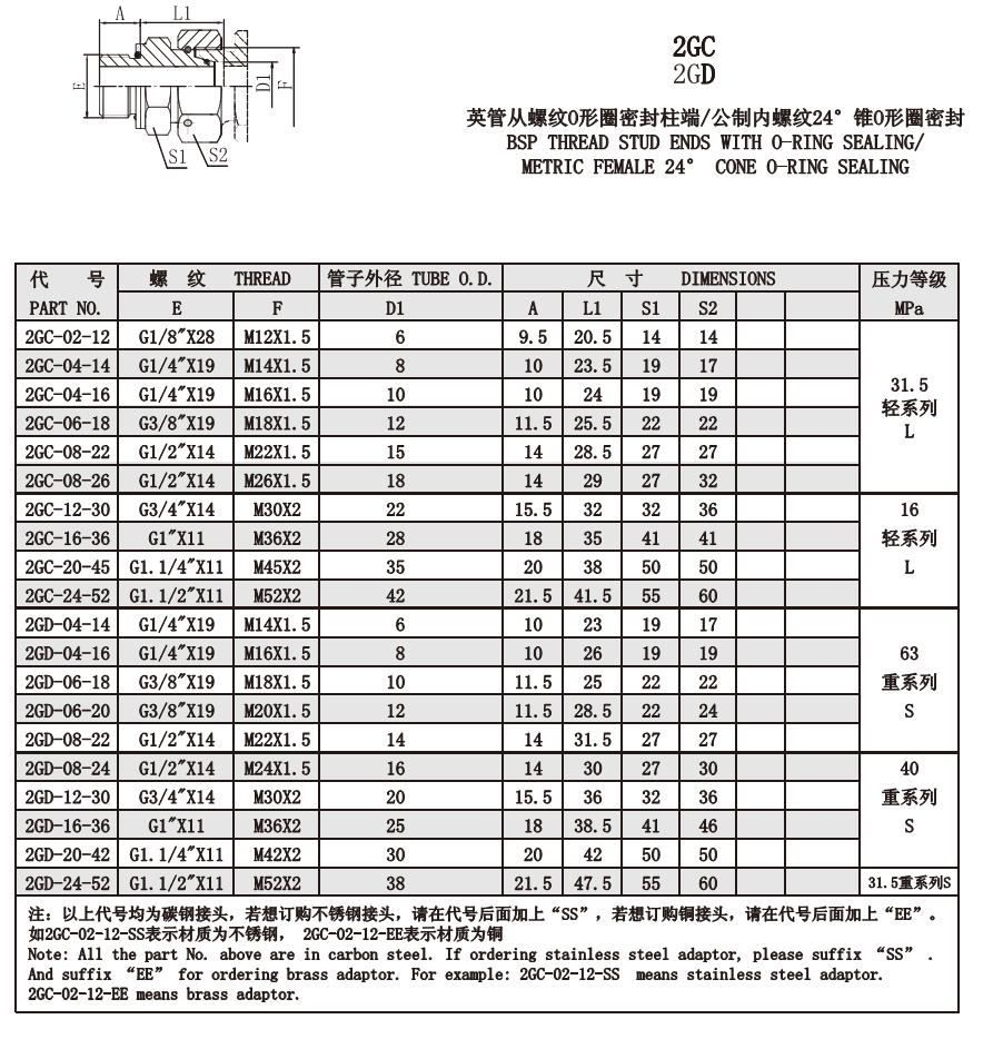 2GC 1GD 英管从螺纹O形圈密封柱端/公制内螺纹24°锥O形圈密封