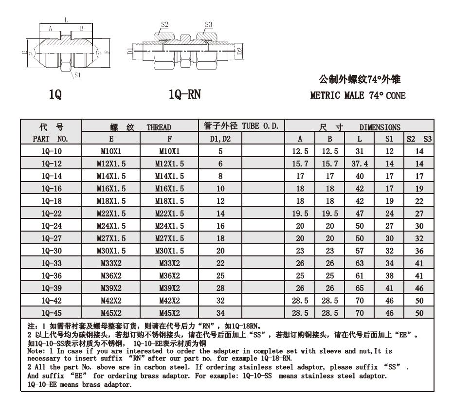 1Q 1Q-RN Metric Male Thread 74° Male Cone