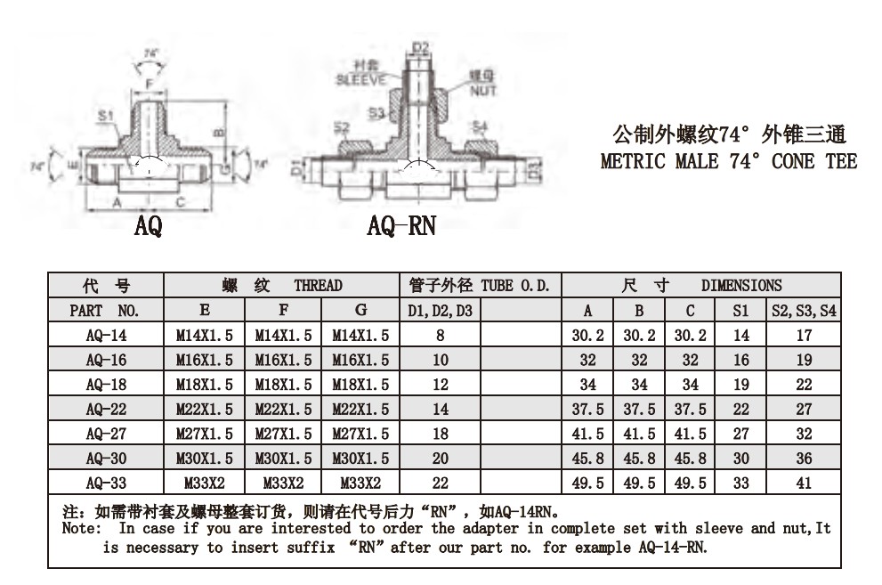 AQ AQ-RN 公制外螺纹74°外锥三通