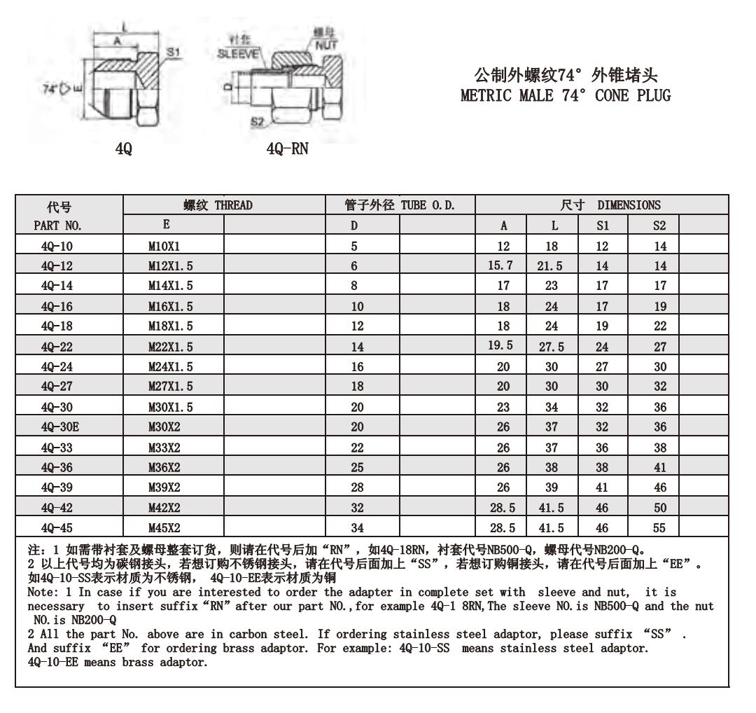 4Q 4Q-RN 公制外螺纹74°外锥堵头