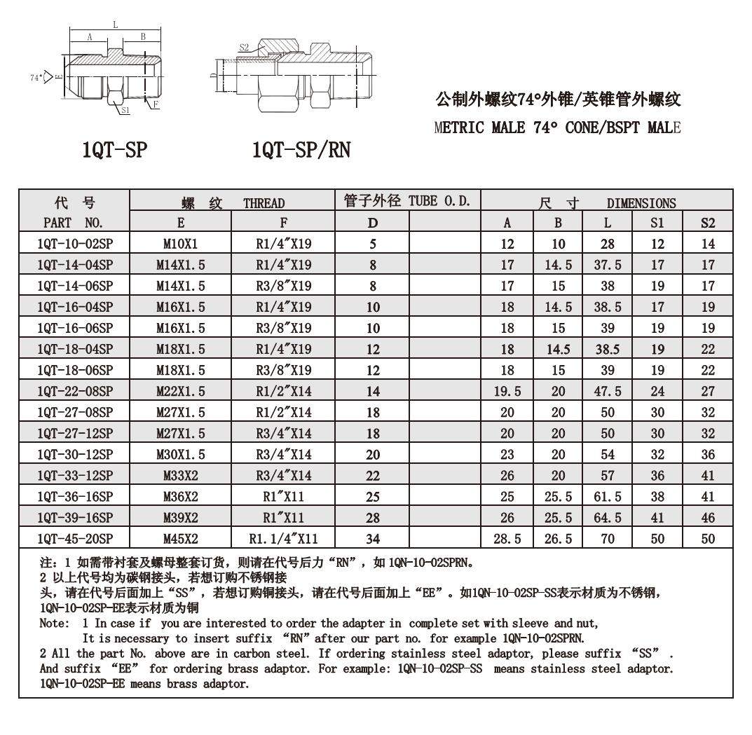 1QT-SP 1QT-SP/RN 公制外螺纹74°外锥/英锥管外螺纹