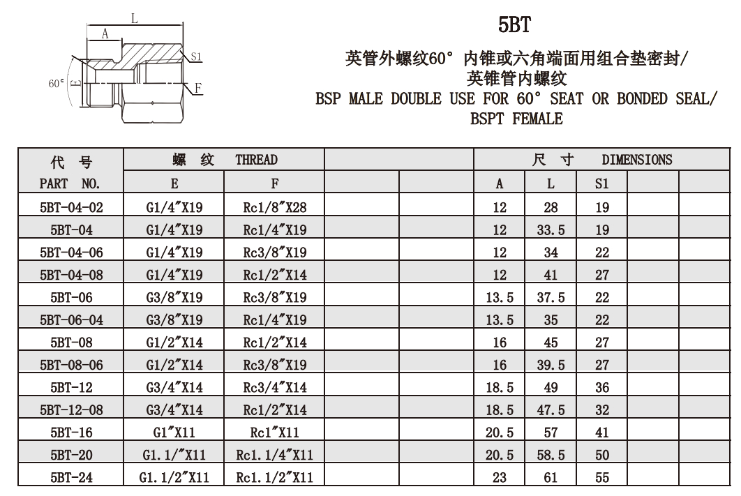 5BT British pipe male thread 60°inner cone or hexagonal end face with combined gasket seal / British cone pipe female thread