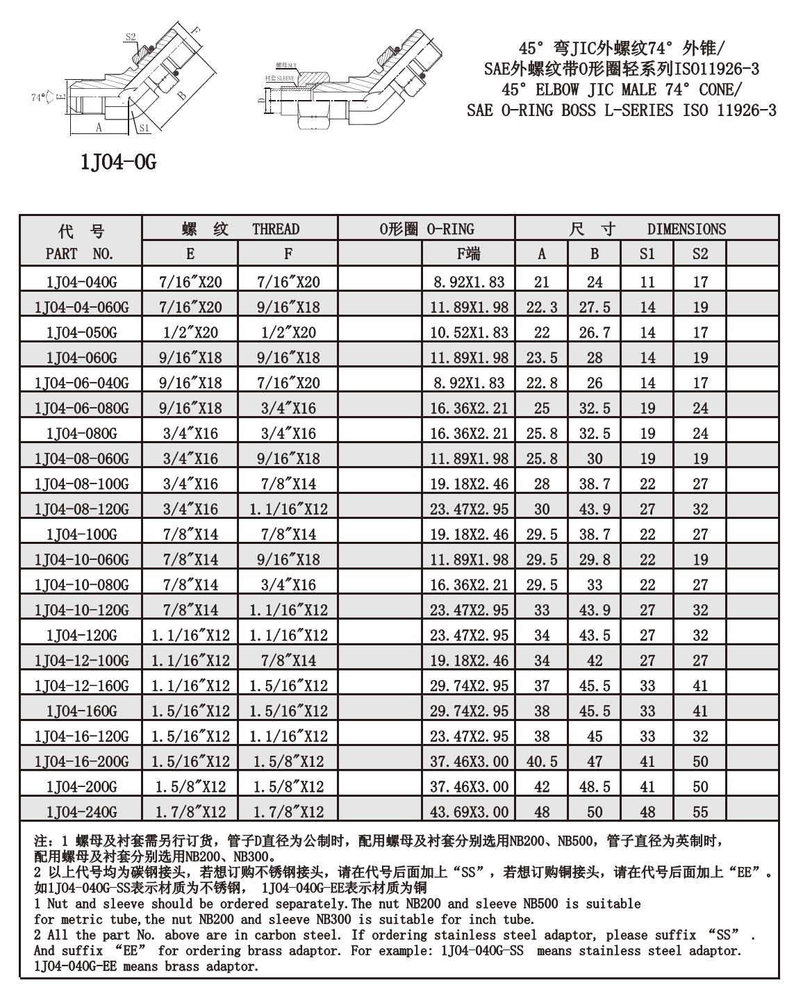 1J04-OG 45°弯JIC外螺纹74°外锥/ SAE外螺纹带O形圈轻系列ISO11926-3
