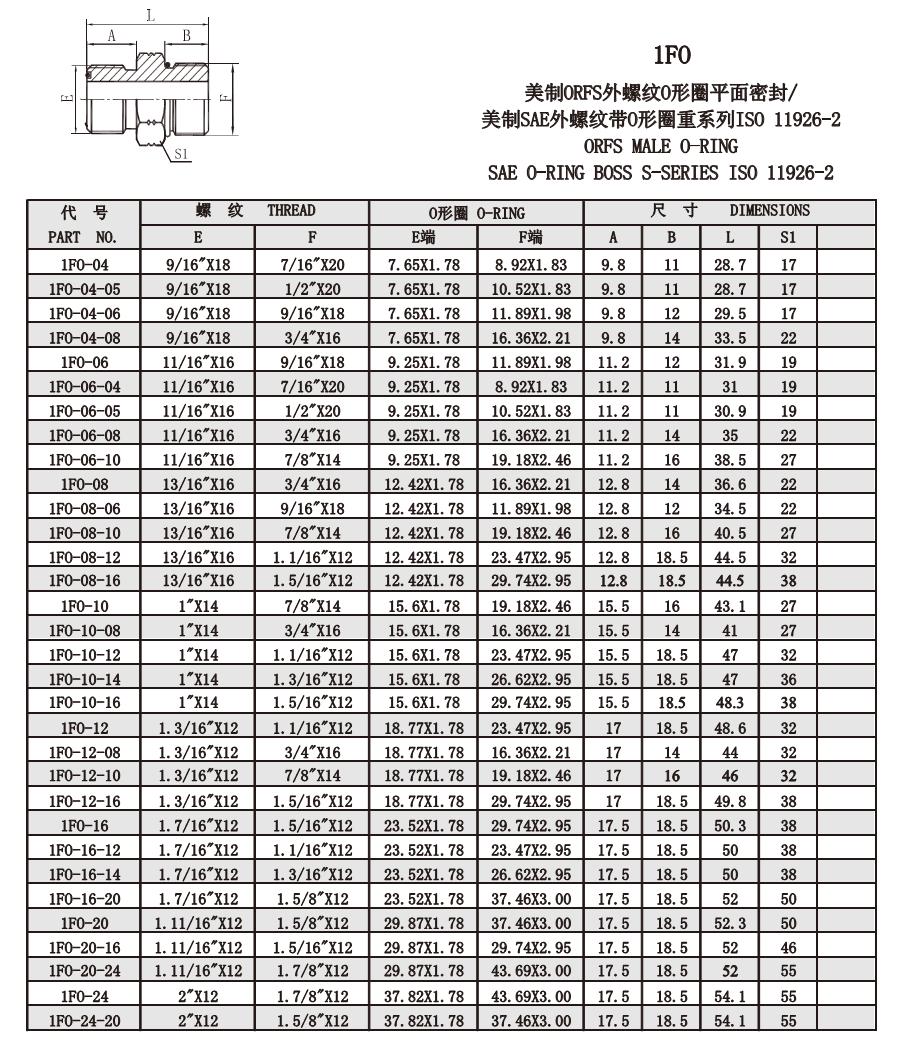 1F0 美制ORFS外螺纹O形圈平面密封/ 美制SAE外螺纹带O形圈重系列ISO 11926-2