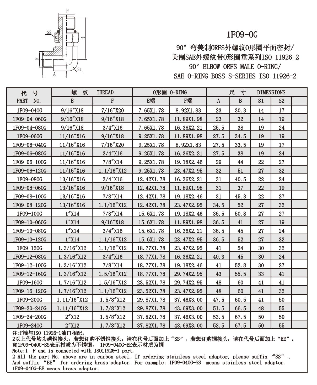 1F09-OG 90°弯美制ORFS外螺纹O形圈平面密封/ 美制SAE外螺纹带O形圈重系列ISO 11926-2