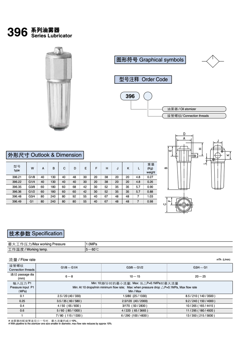 396 series technical parameters of lubricator 1. Maximum working pressure: 1.0MPa 2. Working temperature: 0-50°C 3. Flow rate: M3/h(l/min) takeover thread WG1/8"G1/4G3/8"G1 /2G3/4"G1 diameter mm6810152025Input pressure