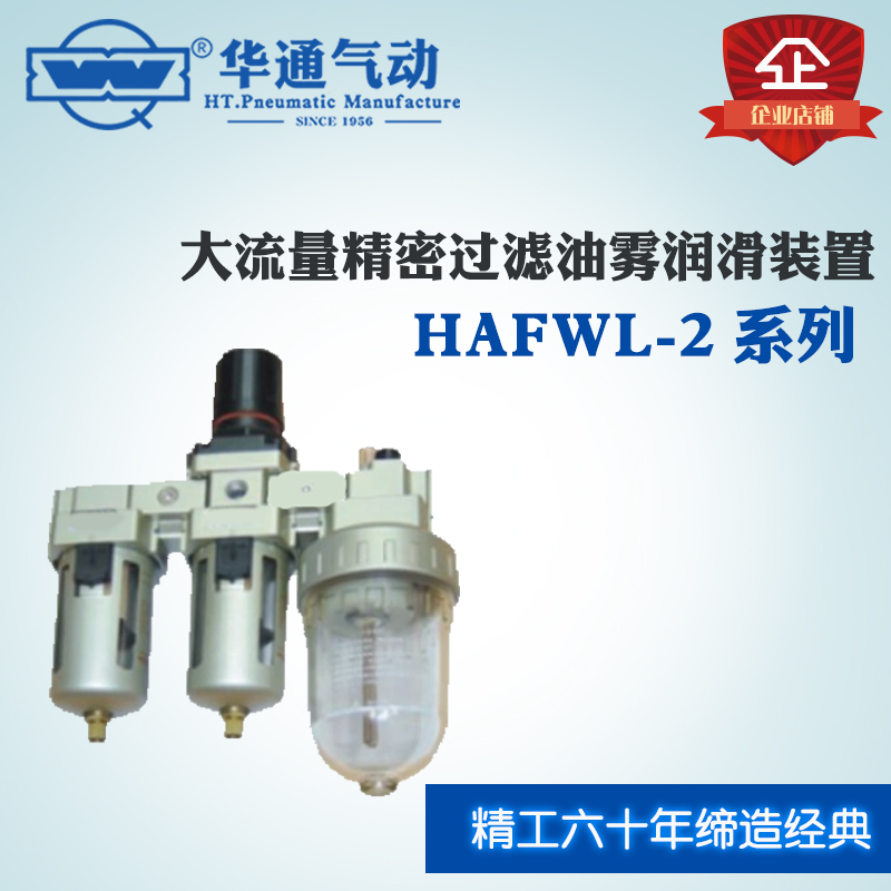HAL-2二次油雾器与AF4000-04空气过滤器、AW4000-04空气过滤减压阀组合 为HAFWL-2大流量精密过滤油雾润滑装置,应用于轴承生产流水线上,在轴承磨削工序中对轴承和磨头起油雾润滑作用。