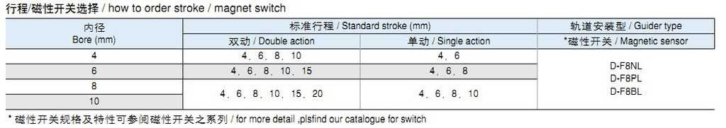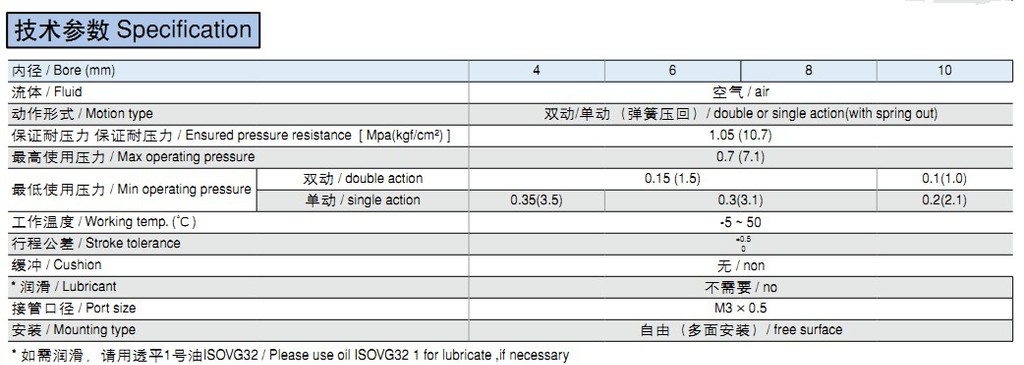 Technical parameters Specification Inner diameter / Bore (mm) 4 6 8 10 Fluid / Fluid Air / Air Action Form / Moti