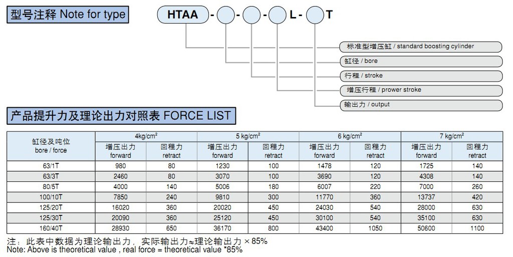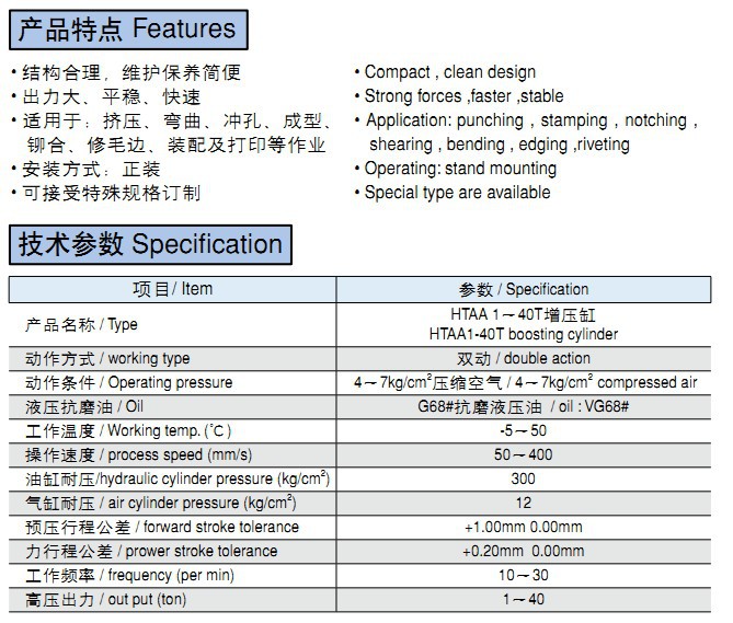 Technical parameterSpecification item/ Item parameter/ SpecificationProduct name/ TypeHTAA 1~40T boosting cylinderHTAA1-40T boosting cylinderAction mode/&nb