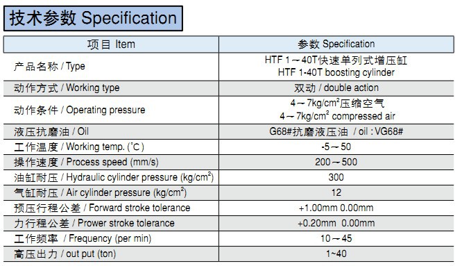 Technical parameterSpecification itemItem parameterSpecificationProduct name/ TypeHTF 1~40T fast single row boosting cylinder HTF 1-40T boosting cylinder&l
