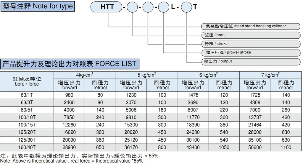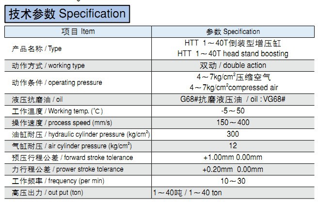 Technical parameterSpecification itemItem parameterSpecificationProduct name/ TypeHTT 1~40T Flip-chip booster cylinder HTT 1~40T head stand