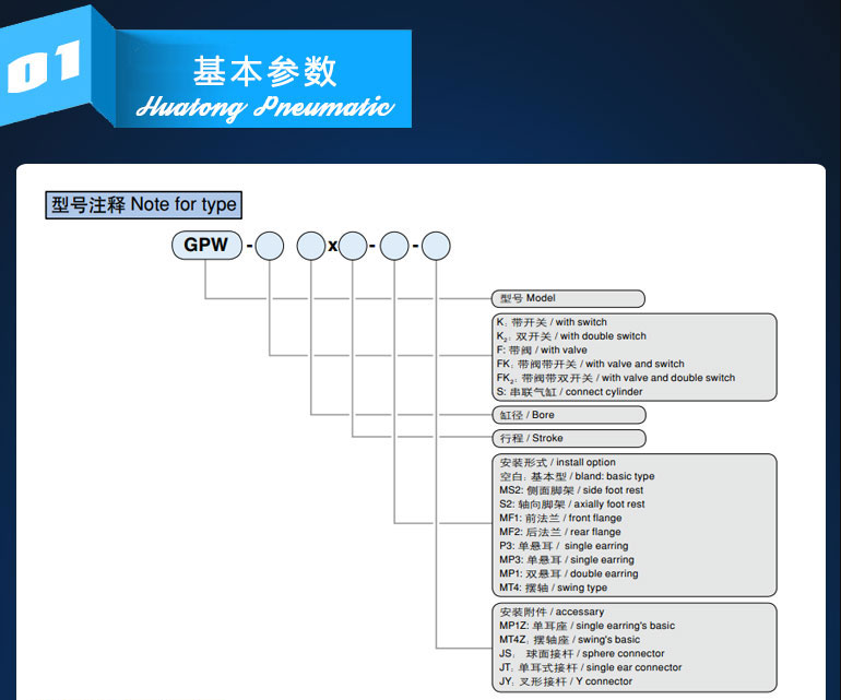 Huatong pneumatic square cylinder GPW series, square cylinder is a new generation of pneumatic actuator developed by our company. The product conforms to ISO/6430 international standard, adopts advanced technology such as intelligent floating buffer and precision die casting, and has various installation forms.