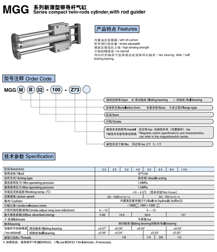 MGG series cylinder with guide rod, small size, light weight, strong side load resistance, strong torsion resistance, high precision of non-swinging, the bearing of the guide rod can choose sliding bearing or ball guide bearing, which is easy to install and use, two-sided takeover position available.
