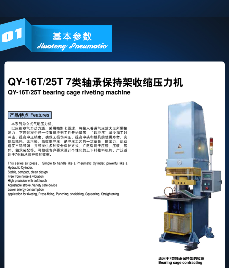 以压缩空气为动力源,采用帕斯卡原理,将输入普通气压放大至所需输出力,下压过程中任一位置感应到工件开始增压,“软冲压”减少加工时冲击,提高冲压精度,确保无损伤冲压,提高冲头和模具的使用寿命,实现低能耗、无污染、高效率冲压,是冲压工艺的一次革命,输出力、运动速度平稳可调,并可提供多种安全保护方式,广泛适用于压铆、压装、压伸、轴承装配等。可根据客户要求设计个性化的上下料推料机构,广泛适用于7类轴承保护架的收缩。