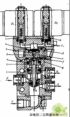 图4所示为先导式双电控二位四通电磁换向阀。它由先导阀(Dl、D2)和主阀组成。而主阀又包括阀体1和活塞组件2两部分。图示的是Dl、D2均处于断电的状态。电磁阀的动铁芯5、6处于关闭状态。当Dl通电、D2断电时,动铁芯5被吸起,由P口来的压缩空气经孔a(虚线)进入阀的f腔。并从密封塞4(单向阀)的四周唇边进入孔‘,并进入。广腔,推动活塞组件2下移,使P与A通,B经阀芯中心孔h与T通(排气)。A口有压缩空气输出的同时,有一部分压缩空气流入孔g,其中一路经节流孔d进入c腔使密封塞4下移封住排气孔b,另一路压缩空气进入f腔,作用在活塞组件2的上端。此时,即使Dl断电,活塞组件2也不会位即该阀具有记忆功能。