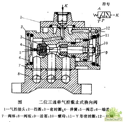 图2所示为二位三通单气控截止式换向阀的结构图。当K口无信号时。A与T通、阀处于排气状态;当K口有信号输入后,压缩空气进入活塞9的有端,使阀杆5左移、P与A通。图中所示的为常断型阀,如果P与T换接则成为常通型。