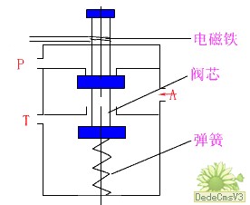 当先导阀D2通电、Dl断电时,动铁芯6被吸起,c腔内的压缩空气经T1口排出。此时从P到A的压缩空气作用在大、小活塞上,因大、小活塞的面积差而产生向上的作用力,使活塞组件2上移。与此同时,密封塞4也上移,并打开阀口3,使活塞组件2上端的压缩空气经孔6排掉。活塞组件2上移后,P与B通,A与T通(排气)。此时即使D2断电,因大小活塞面积差而产生向上的作用力依然存在,所以输出状态也不会改变,即具有记忆功能。气动电磁换向阀与液压电磁换向阀一样,有很多类型,其工作原理也相似,不再赘述。