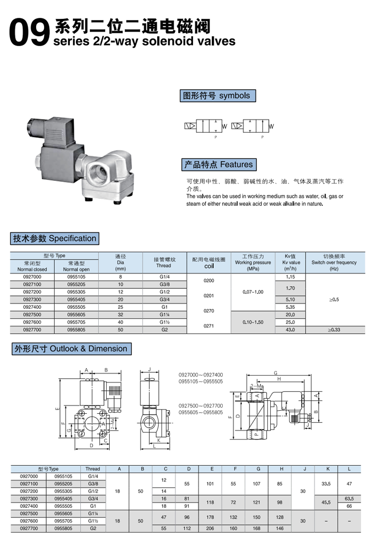 09 series two-position three-way solenoid valve product features can use neutral, weak acid, weak alkaline water, oil, gas and steam and other working media.