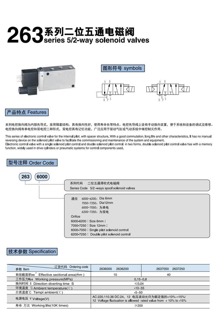 263 series two-position five-way reversing solenoid valve product features 2636000.2637050 electromagnetic reversing valve is widely used in pneumatic automation control systems with good working conditions and small installation space. It receives an electrical signal and can quickly switch the direction of the airflow to achieve the purpose of automatic control. 2636000.2637050