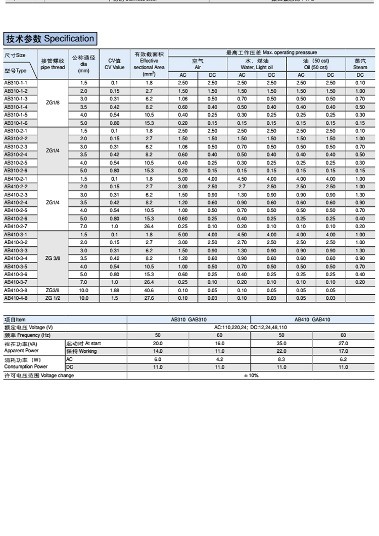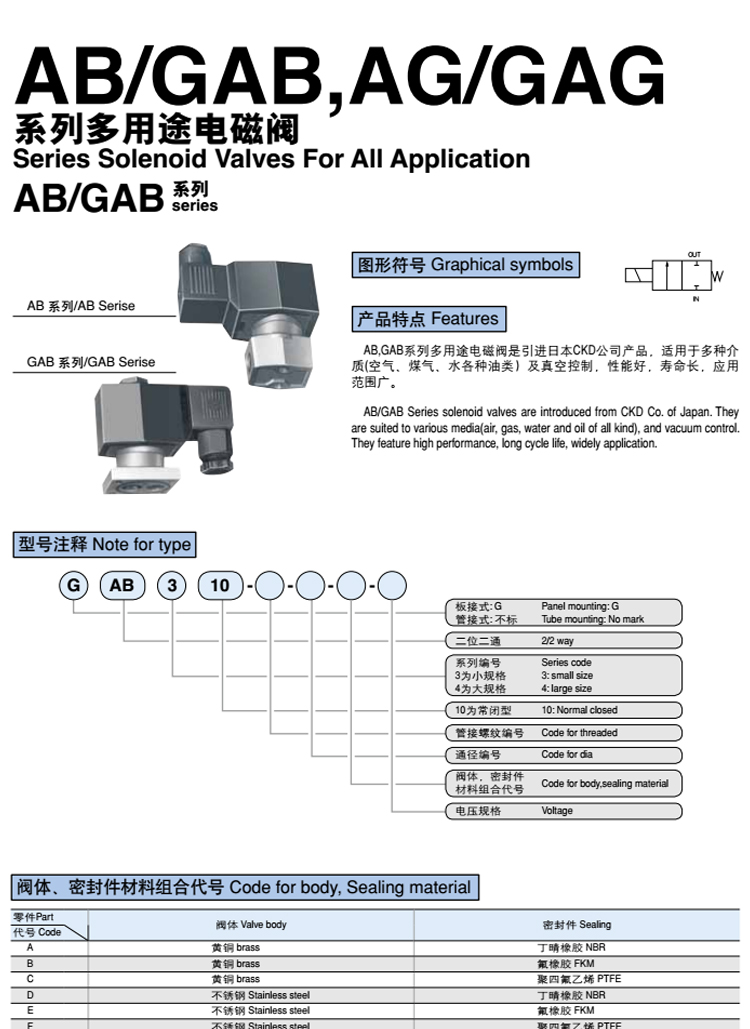 AB-GAB series two-position two-way multi-purpose (pipe type/plate type) solenoid valve Product features: AB, GAB series multi-purpose solenoid valve is imported from Japan CKD company, suitable for a variety of media (air, gas, water, oil, etc.) Class) and vacuum control, good performance, long life and wide application range. AB/GAB Series s