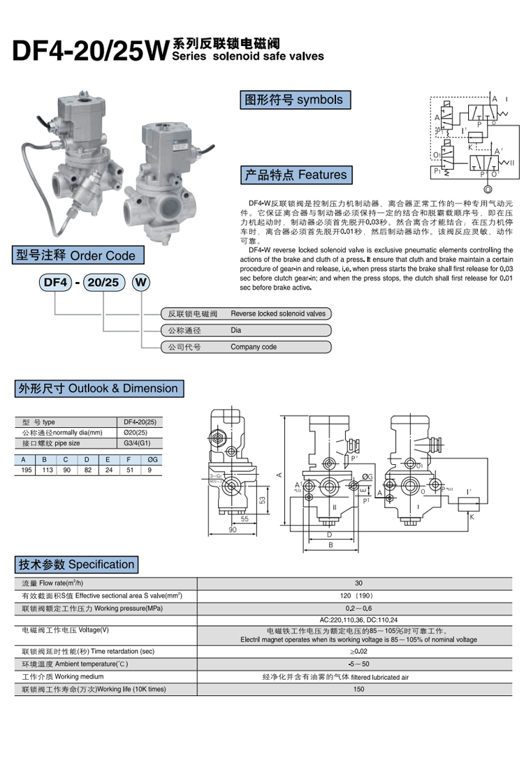 DF4-W series anti-interlock solenoid valve product features DF4-W anti-interlock valve is a special pneumatic component that controls the normal operation of press brakes and clutches. It ensures that the clutch and brake must maintain a certain combination and release sequence number, that is, when the press starts, the brake must first be released for 0.03 seconds. However, the clutch can only be combined; when the press stops, the clutch