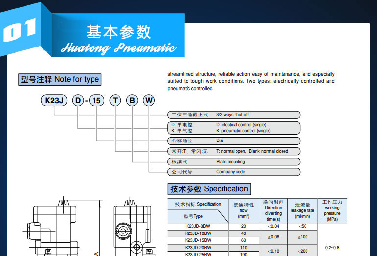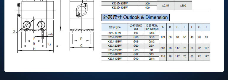 K23J-BW series two-position three-way plate-connected cut-off reversing solenoid valve Product features: K23JD-BW series is a two-position three-way plate-connected cut-off reversing valve. The valve has reasonable structure, reliable action and convenient maintenance, especially suitable for relatively harsh working environment. There are two types of electronic control and pneumatic control.